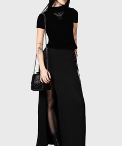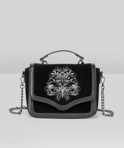 – Statement intricate embroidery featuring mushrooms and death’s-head style moth.