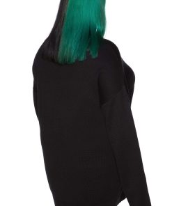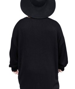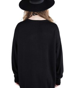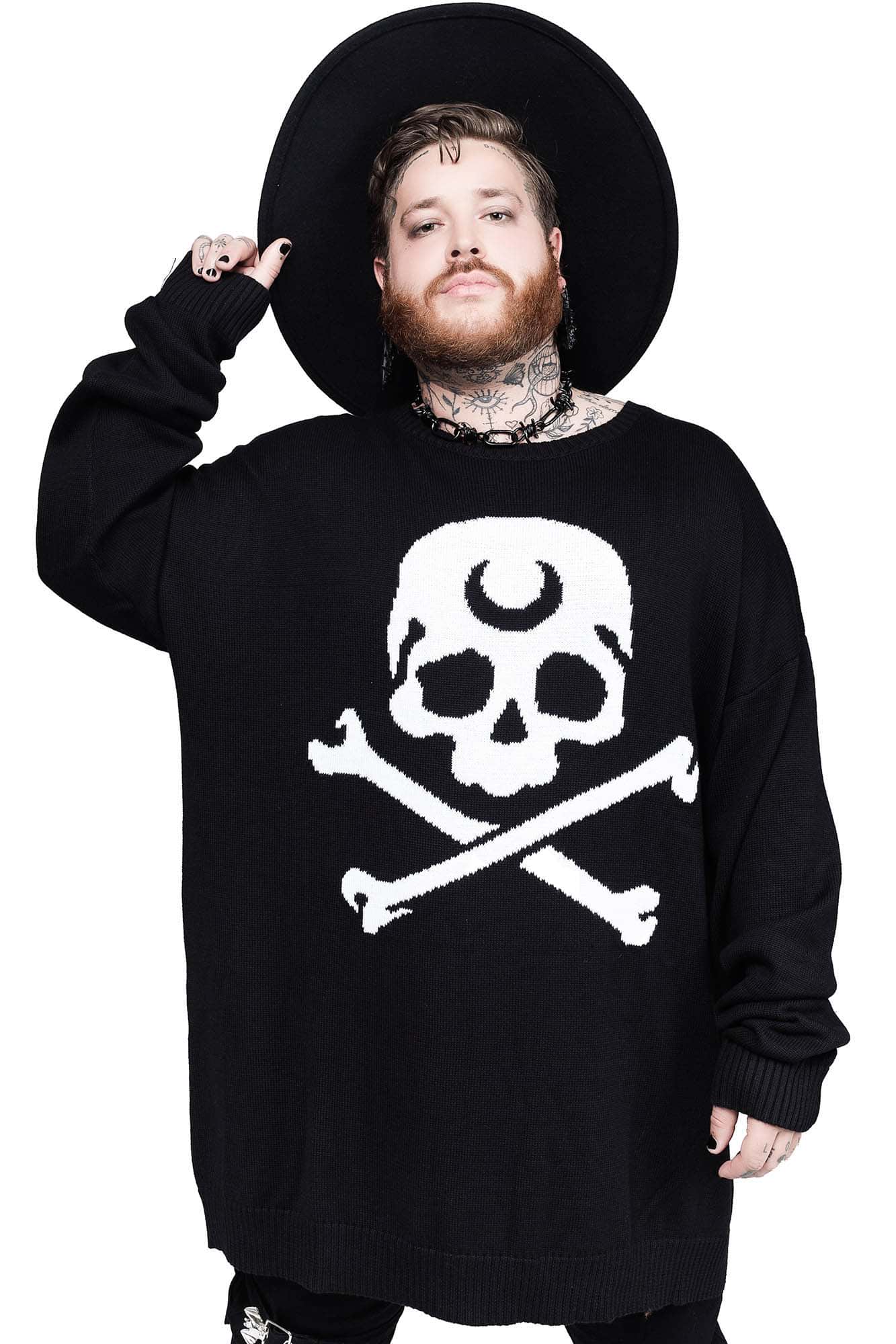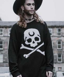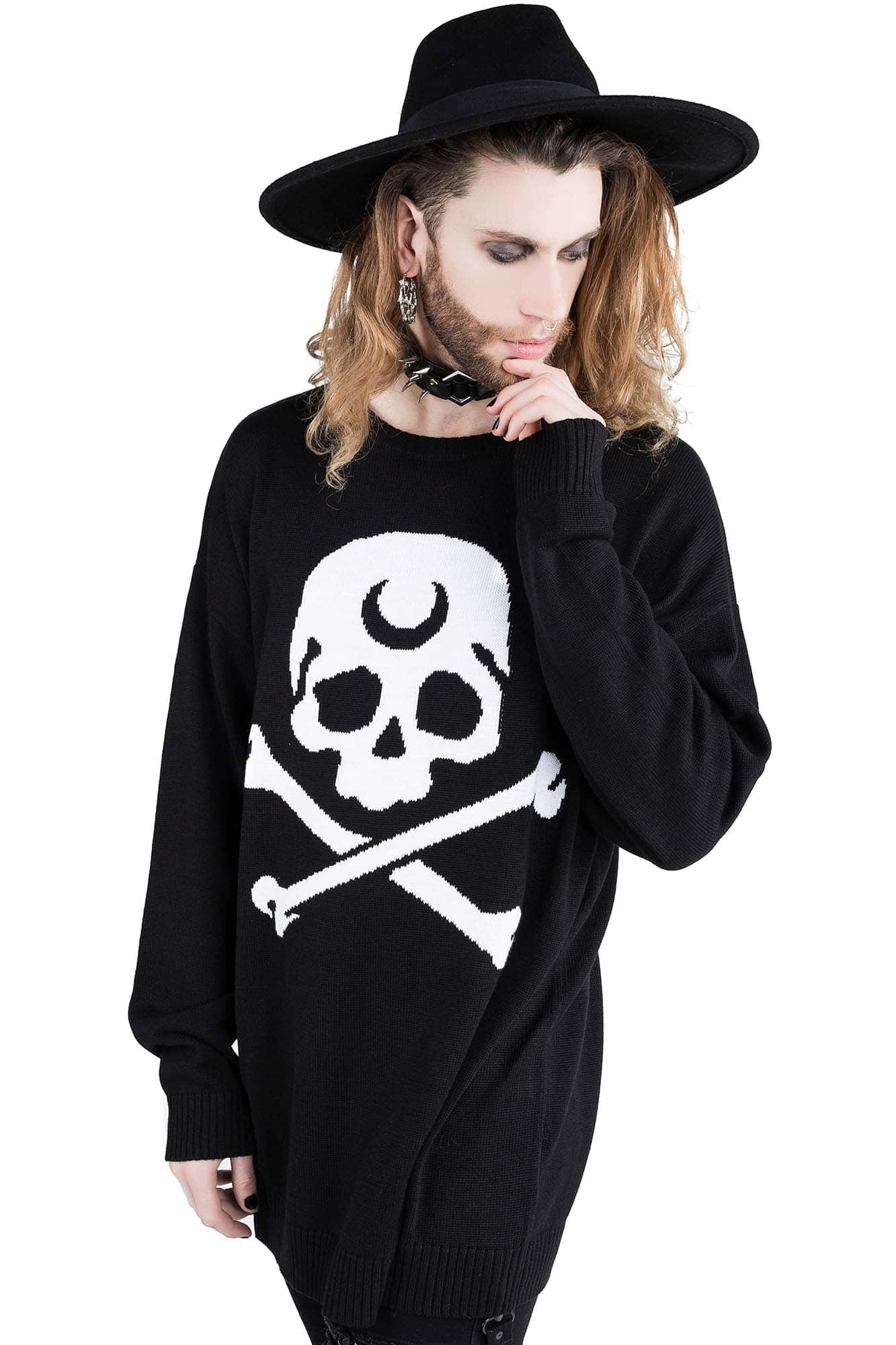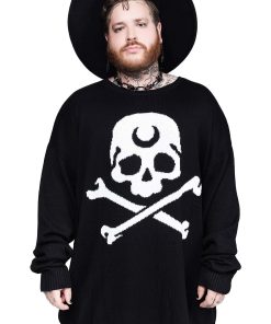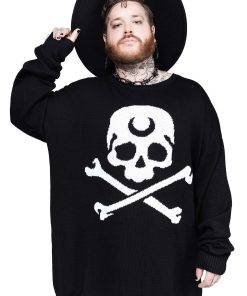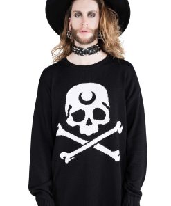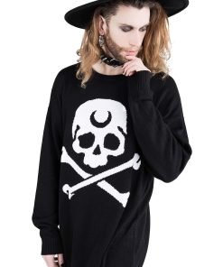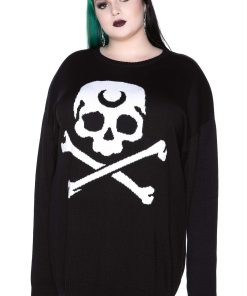 Cozy never looked so good – the ‘2 The Bone’ knit sweater ticks all the boxes. Extra long length to easily be dressed up or down, with a round neck, and contrast skull and bones statement graphic. Dress up or down as you dark heart desires; works both for warmer or colder looks!