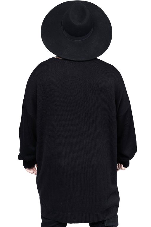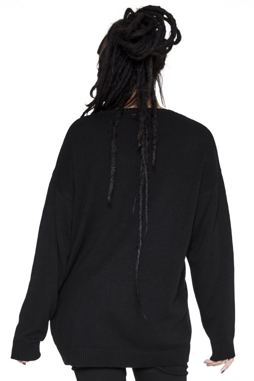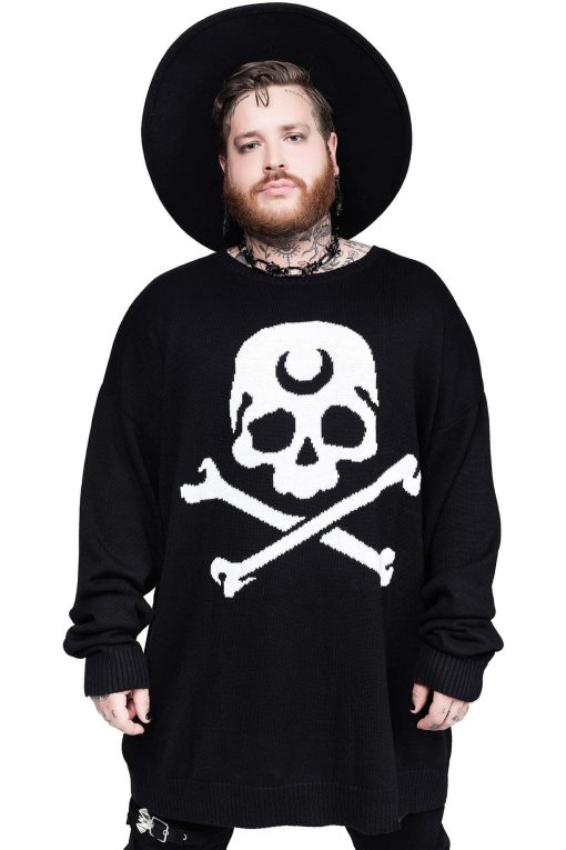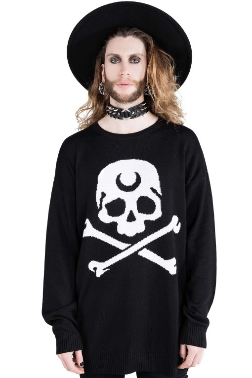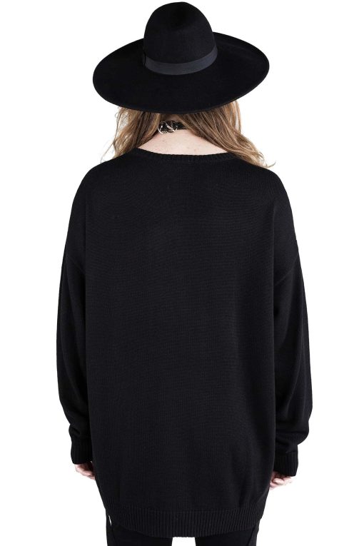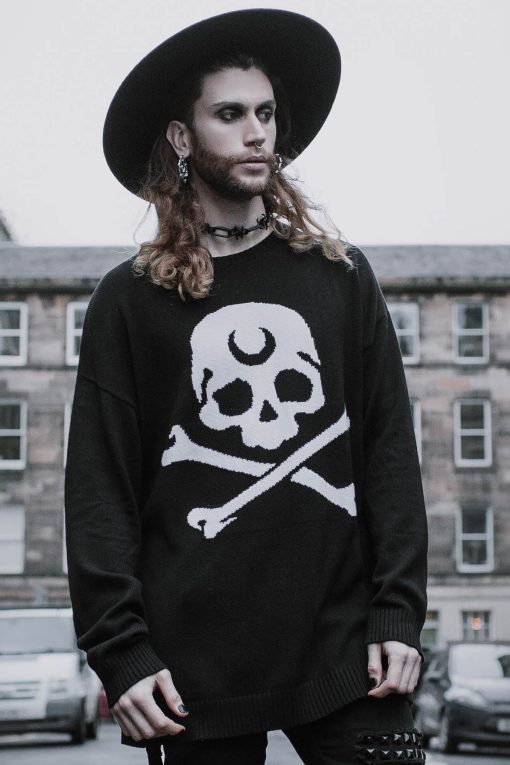 Cozy never looked so good – the ‘2 The Bone’ knit sweater ticks all the boxes. Extra long length to easily be dressed up or down, with a round neck, and contrast skull and bones statement graphic. Dress up or down as you dark heart desires; works both for warmer or colder looks!